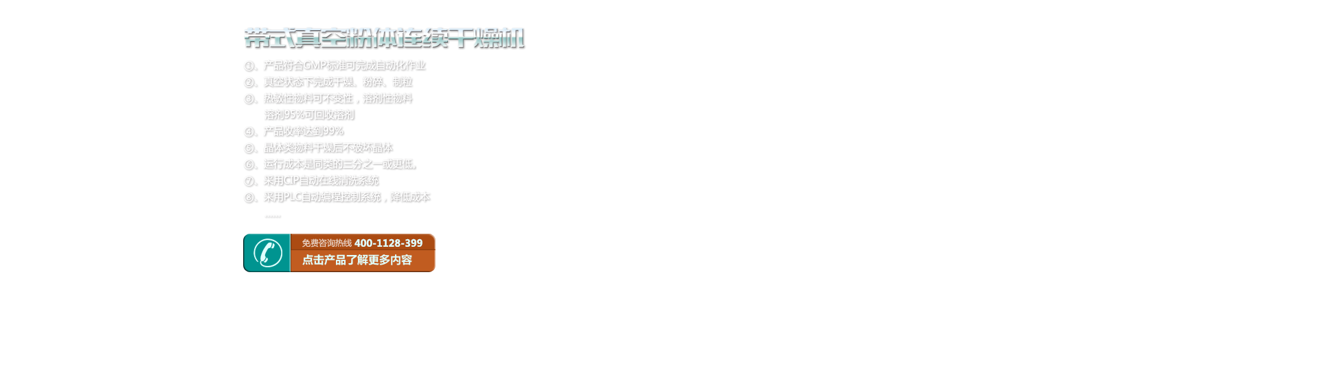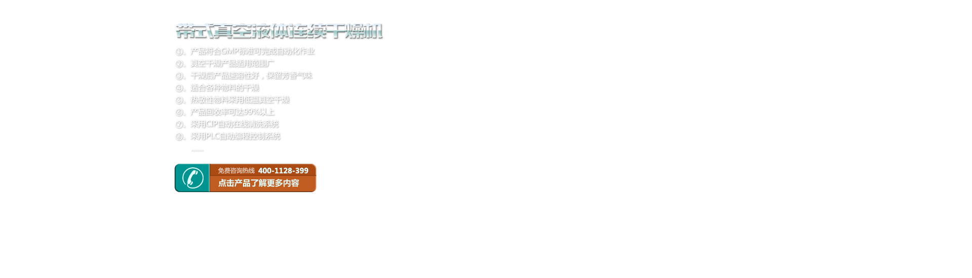 該機(jī)為提醇的高濃度、高粘度的中藥浸膏解決了一大難題,以往采用離心噴霧,因?yàn)闇囟?,熱敏性成份遭破壞、易粘壁;采用真空烘箱因時(shí)間長(zhǎng)、能耗高、易染菌、易返潮,無(wú)法連續(xù)生產(chǎn),均達(dá)不到GMP質(zhì)量標(biāo)準(zhǔn)。